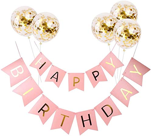 Happy Birthday Banner Birthday Bunting with 5 Gold Confetti Latex Balloons Perfect for Birthday Party Backdrop Decorations (Pink)