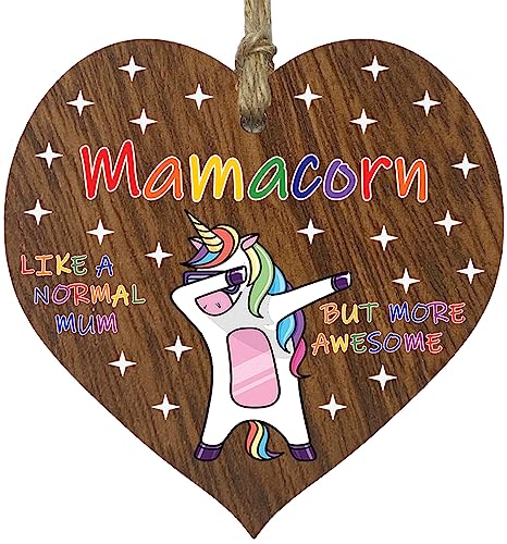 Mum Birthday Gift for Her - Mamacorn - Wooden Heart Plaques, Dark Wood Sign Keepsake, Funny Mom Happy Birthday Plaque Mum Gifts Unicorn Awesome Mum Present from Son or Daughter