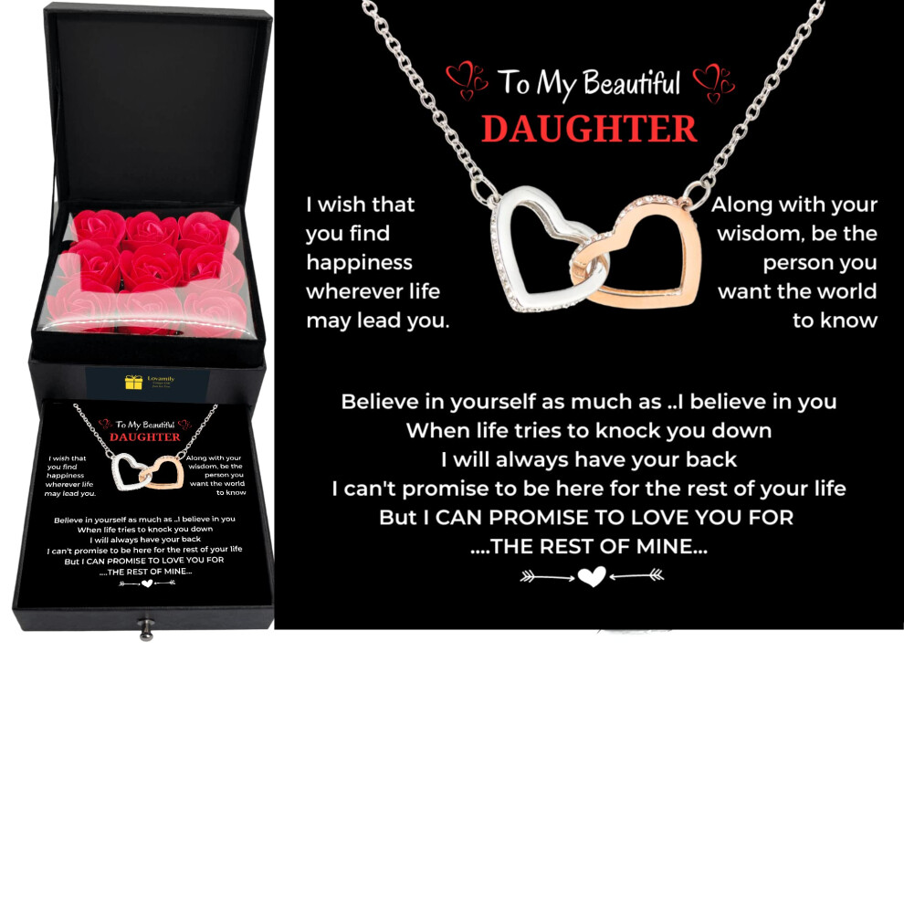 LOVAMILY Daughter Necklace Gift from Mom Dad Interlock Heart Pendant with Message Card in Red Eternity Rose Flower Box Present on Birthday Valentine's
