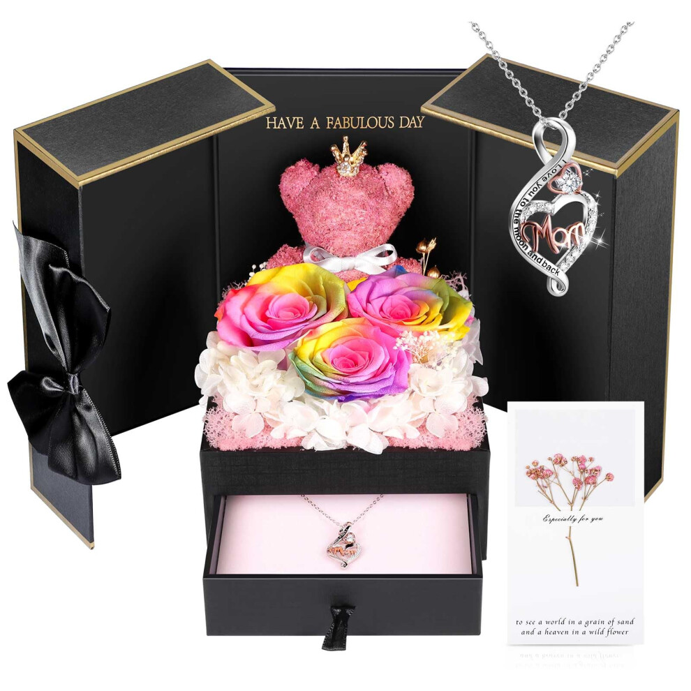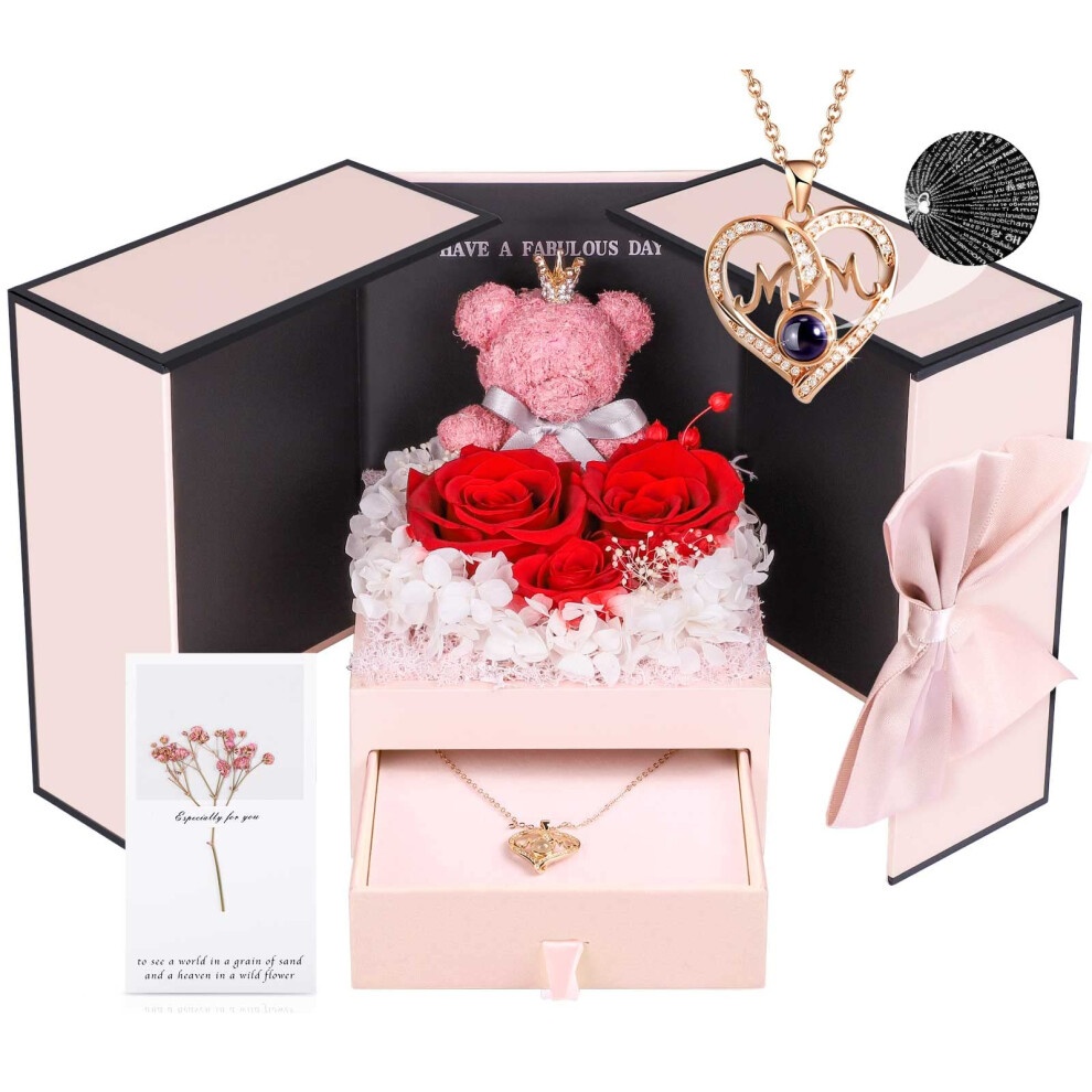 Preserved Roses Gift for Mom with 100 Languages Love Necklace, Unique Birthday Present from Daughter and Son
