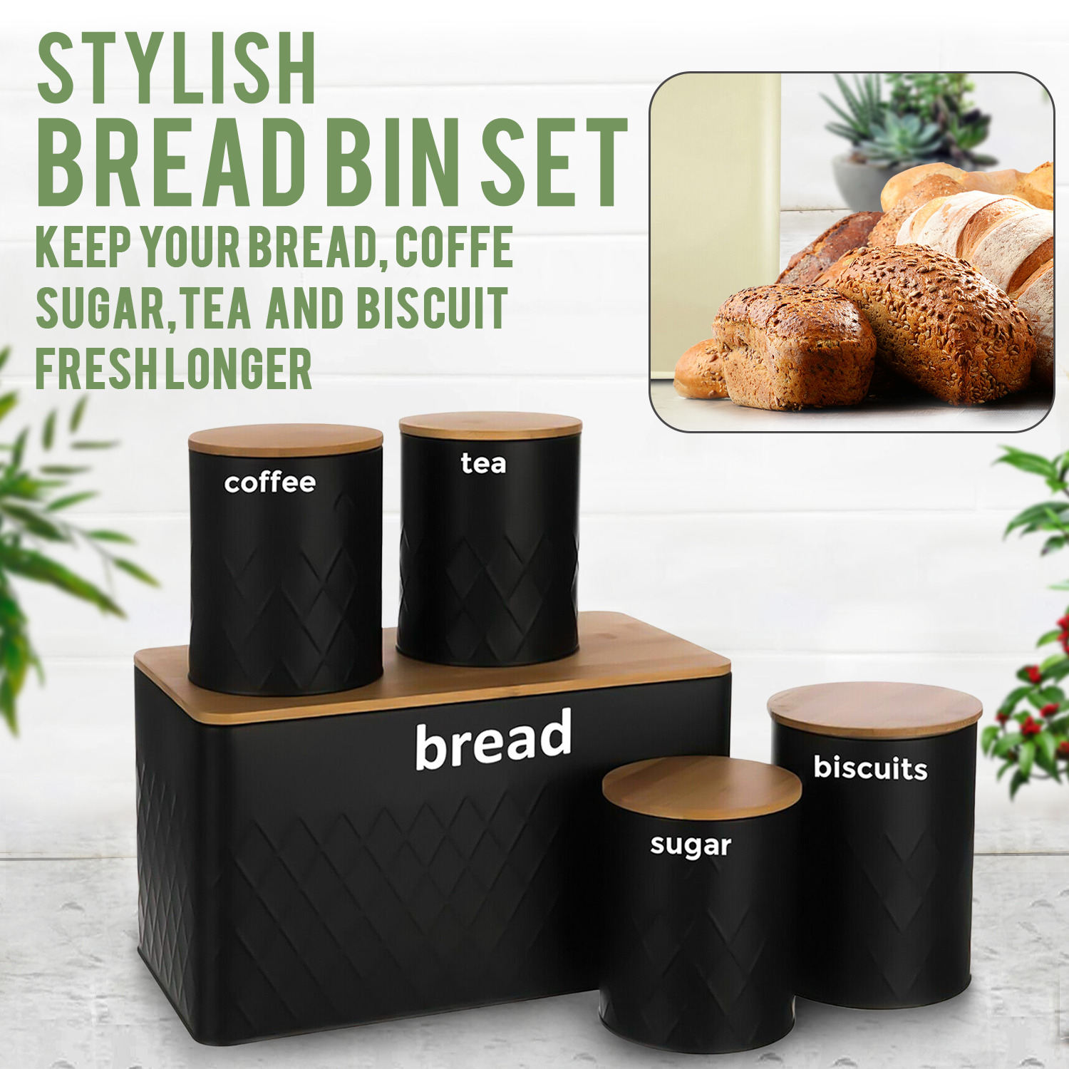 Bread Bin Biscuit Barrel Tea Coffee Sugar Canisters Tins Air Tight 5 Piece Set