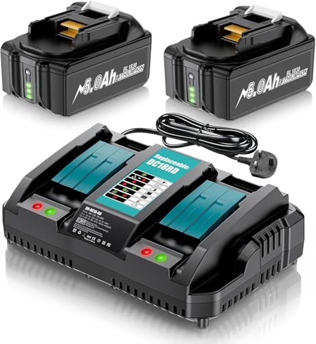 5.0Ah Replacement for 18V Battery and Charger, 2 Pack Li-ion BL1860B Battery + 6A DC18RC Dual Port Replacement Charger for BL1850 BL1860 BL1820 BL1850B BL1830 BL1840 Cordless Tools