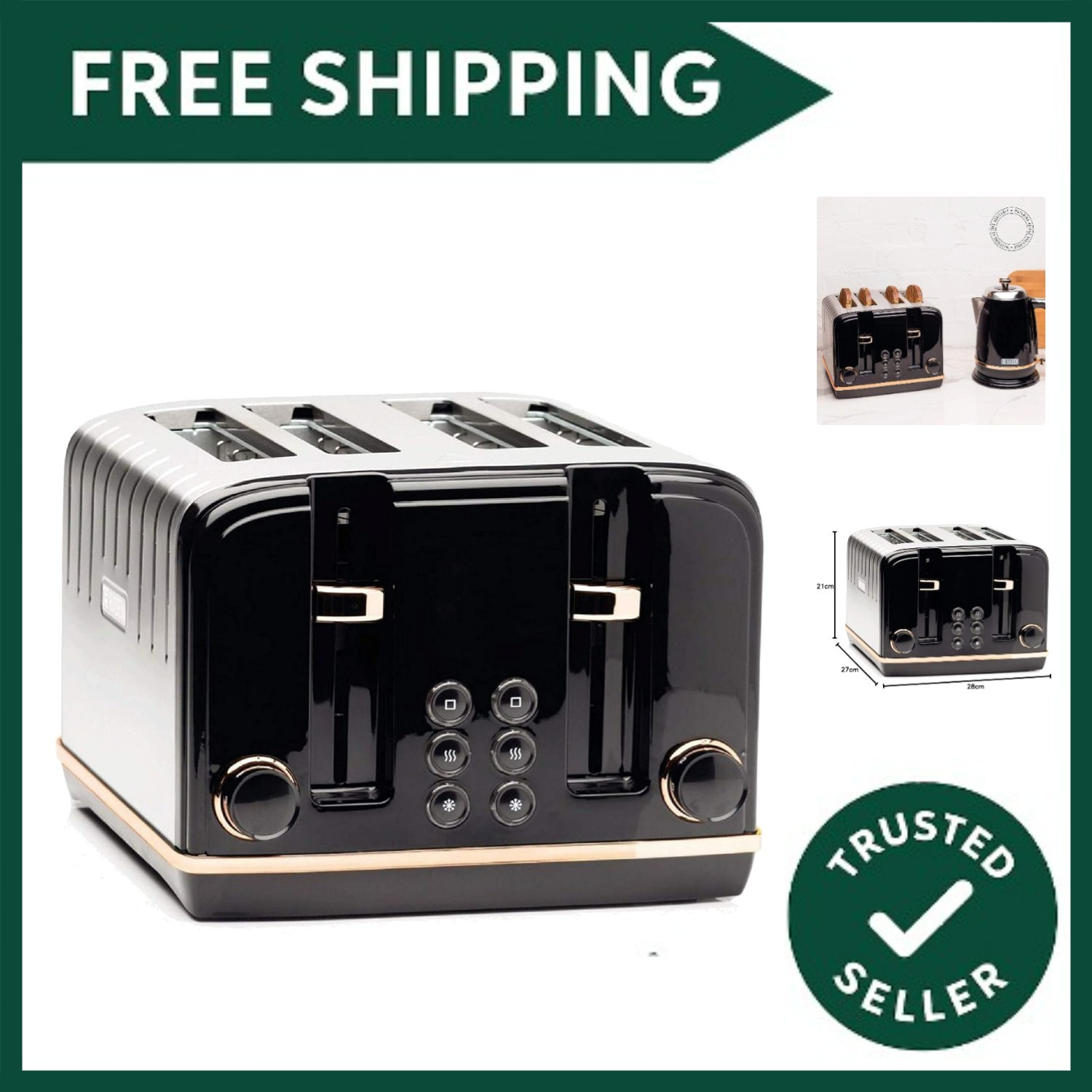 Black 4 Slice Toaster Kettle Set Rose Gold Rim Rapid Boil 3000W Glossy Honeycomb