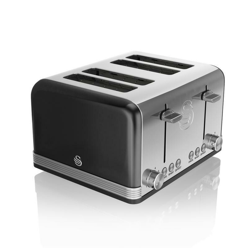 (Black) Swan Symphony 4 Slice Toaster 930W Reheat Defrost Cancel Functions with Slide Out Crumb Tray