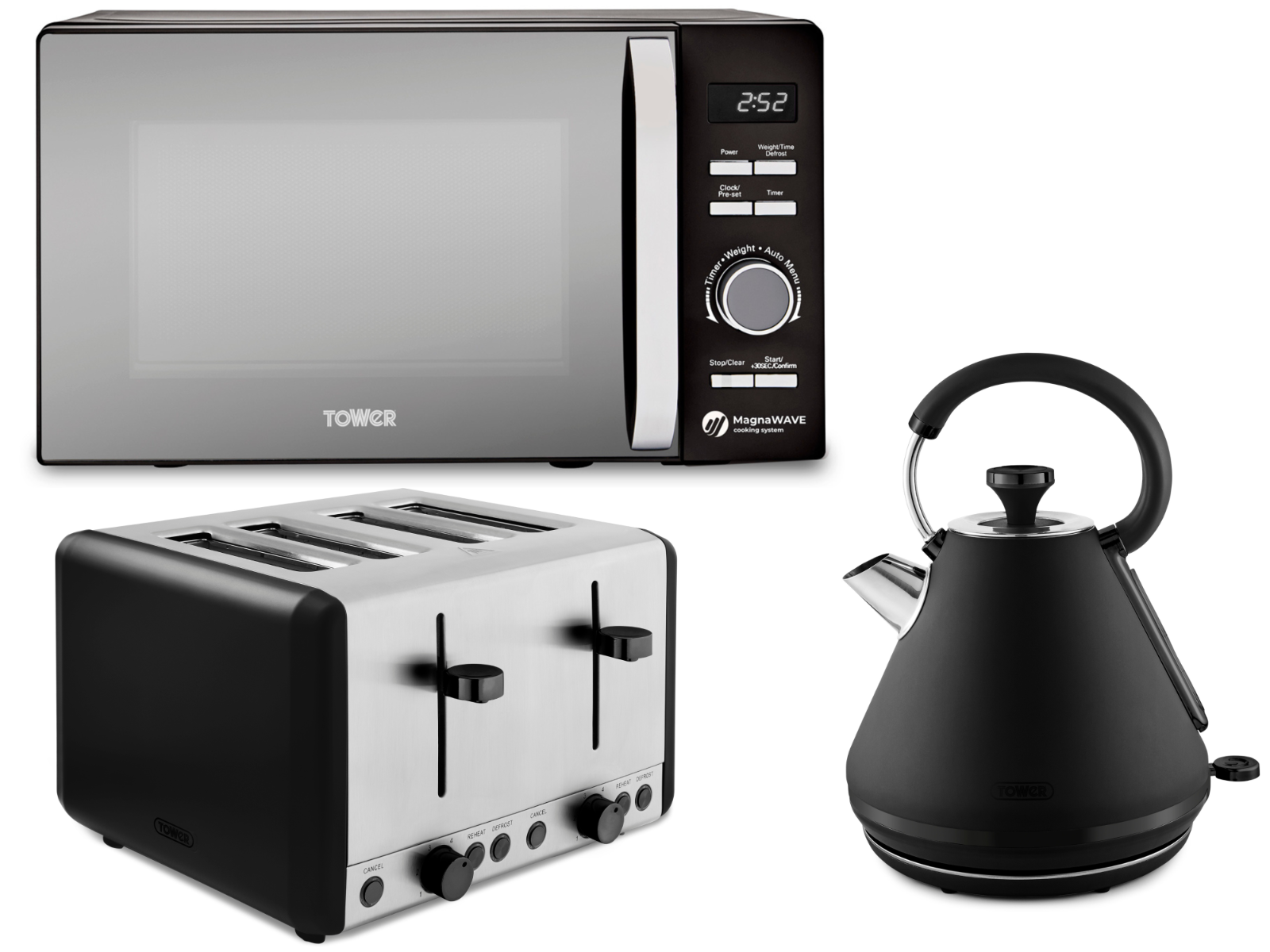 Tower Ash Black Pyramid Kettle 4 Slice Toaster & T24042BLK Manual Microwave Set