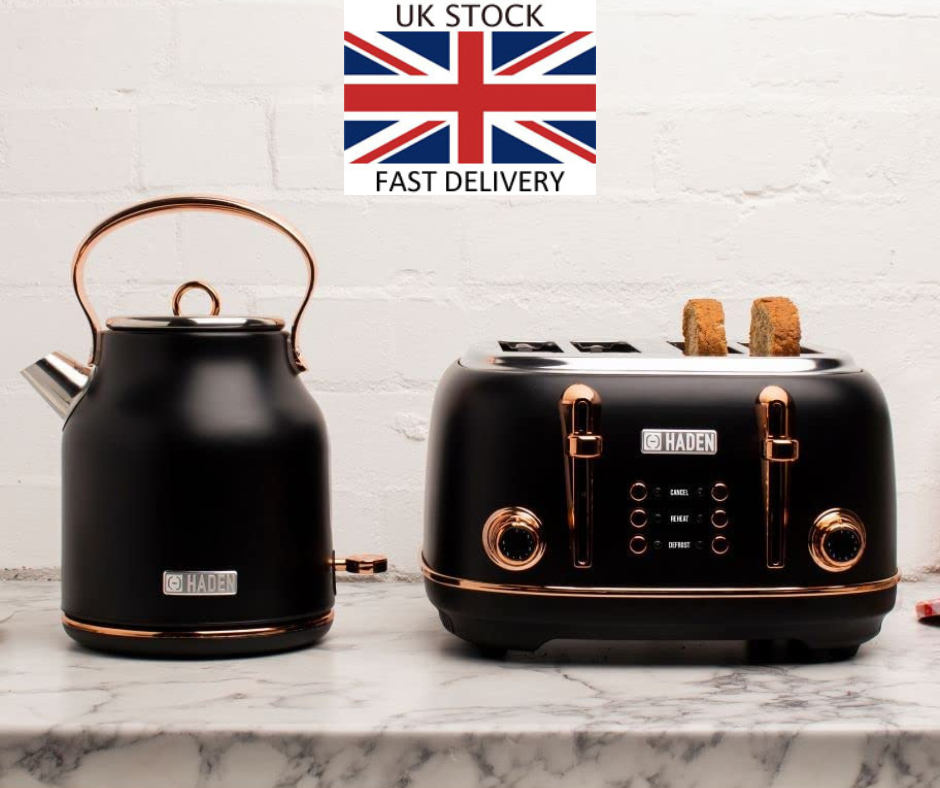 Haden Heritage Retro Rapid Boil Kettle & Matching Black & Copper 4 Slice Toaster