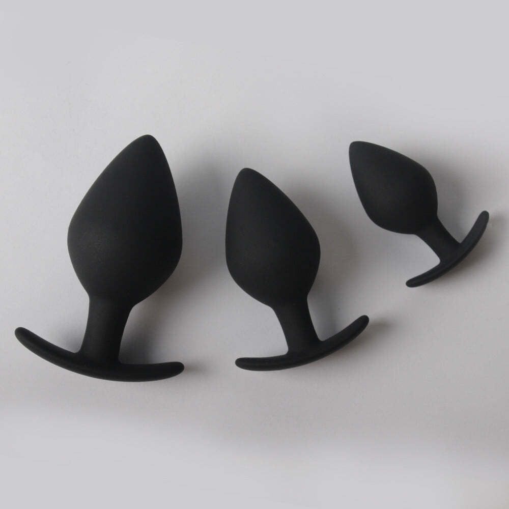 3pcs Silicone Black Anal Butt Plug Set with T-Bar Base