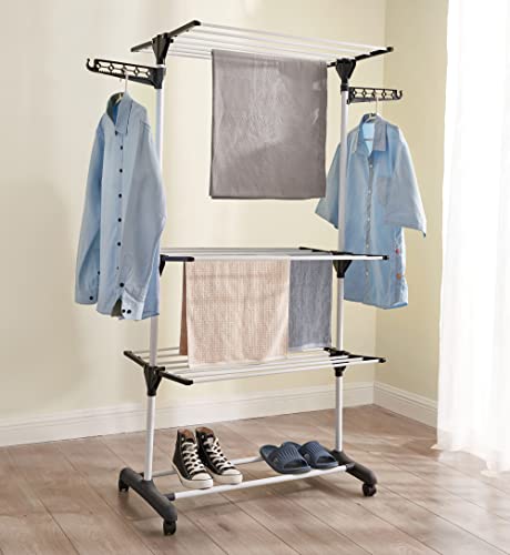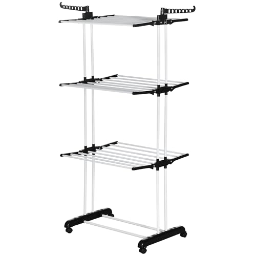 VOUNOT® 3-Tier Folding Tower Clothes Airer Large Capacity 25m Drying Rack with 4 Wheels 2 Side Wings for Indoor and Outdoor Use Black