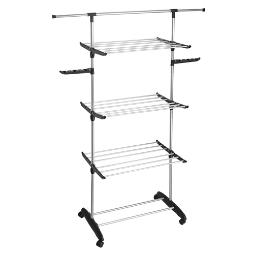 KITCHEN MOVE Multifunctional Clothes Airer, Large Capacity, 70-122 x 50 x 162 cm, Stainless Steel, Black and Grey, 18 m
