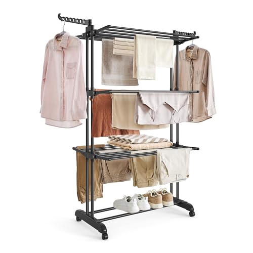 SONGMICS Large Clothes Airer, Foldable Clothes Drying Rack Laundry 4-Tier, Moveable Clothes Horse, 63.5 x 128 x 173 cm, Stainess Steel, Folding Wings, Indoor Outdoor Use, Ink Black LLR701B01