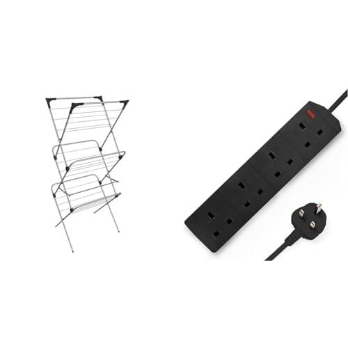 Vileda Sprint 3-Tier Clothes Airer, Indoor Clothes Drying Rack with 20 m Washing Line, Silver & DESIRETECH Black Electric Extension Lead 4 Gang 2 Metre | 2m Long Cable