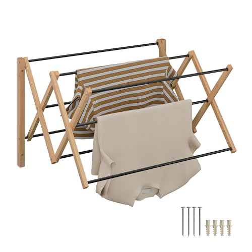 Relaxdays Retractable Clothes Airer for Wall, Folding, 45 x 71.5 x 59 cm, Laundry Drying Rack, Bamboo Iron, Black, 45x71,5x59cm