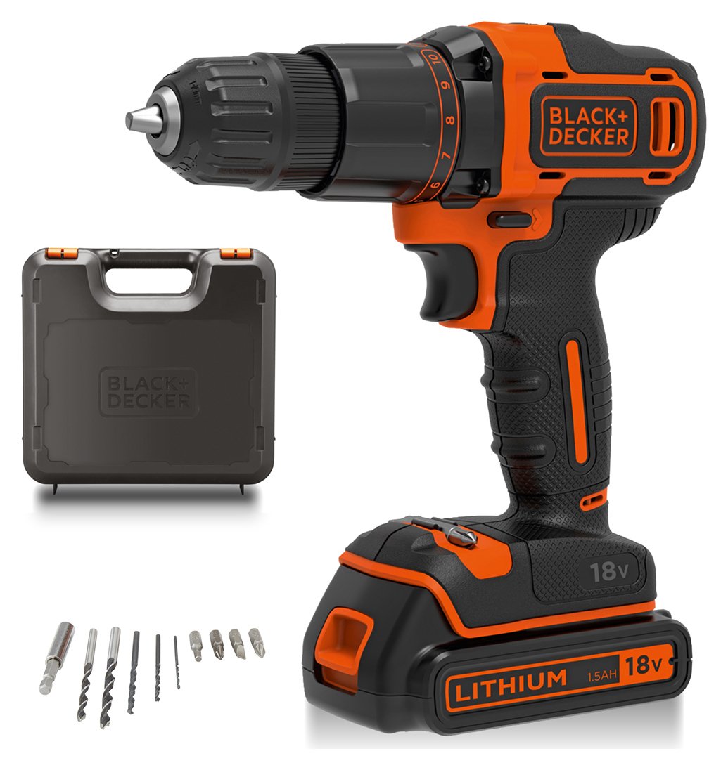 Black + Decker Cordless Hammer Drill with Battery, Charger & Bits 18V BDP0304