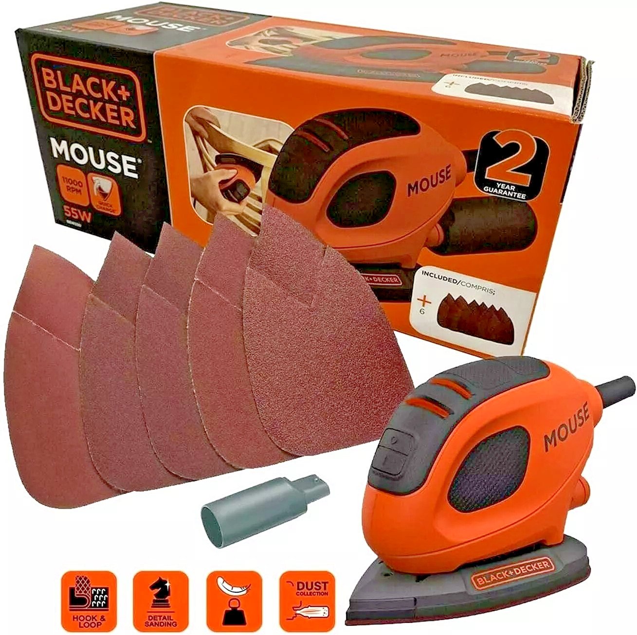 BLACK+DECKER 55W Detail Mouse Sander BEW230-GB with 6 Sanding Sheets 0-11000 rpm, Dust Extraction, Hook-and-Loop Pad