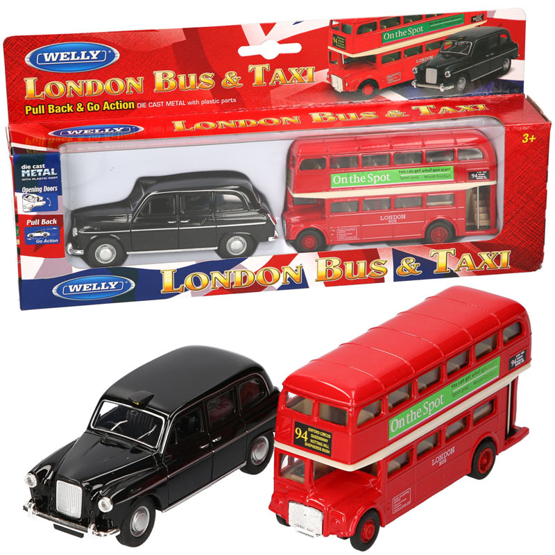 London Red Double Decker Bus and Black Taxi Vehicle Set, Multi Fun Game Activity