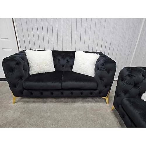ark future Luxury 2 Seater Black Velvet Sofa with Gold Metal Legs – Chesterfield Style Couch with Tufted Backrest, Wide Arms & Foam Cushions – Modern Living Room Furniture