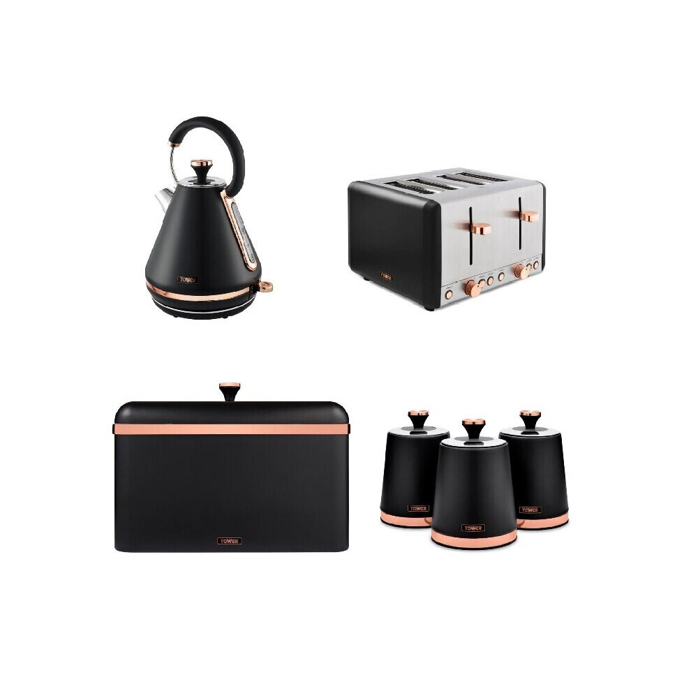 Tower Black & Rose Gold Cavaletto Pyramid Kettle 2 Toaster Bread Bin Canisters