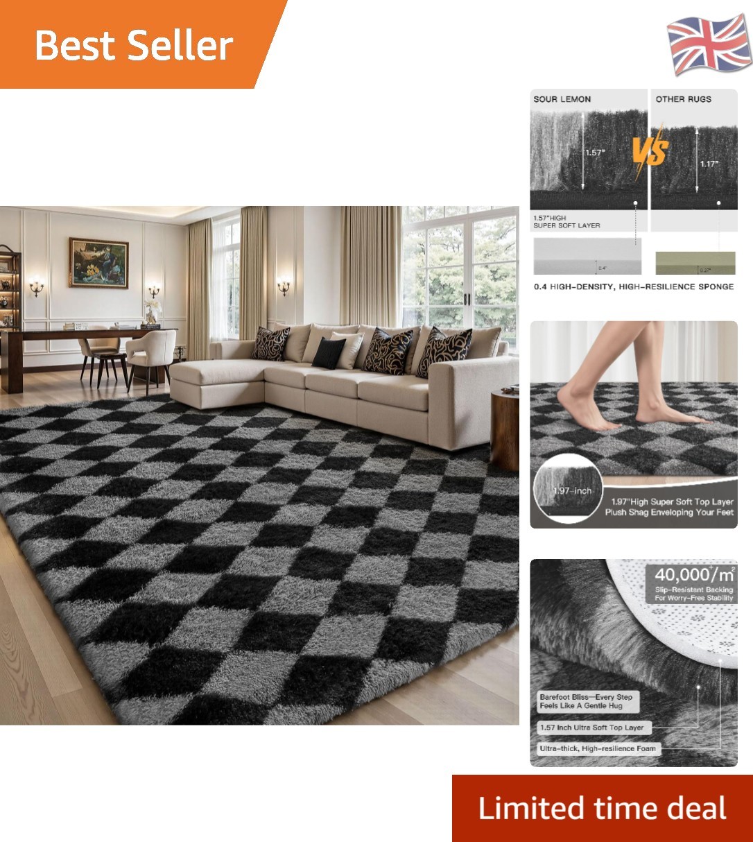 Elegant Black and Grey 120x160cm Checkered Rug - Fluffy, Stain-Resistant Design