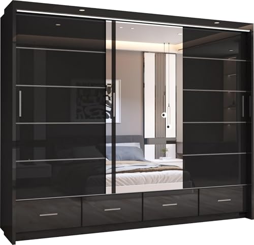 MN Furniture Derry High Gloss & Mirror Sliding Doors Wardrobe with Long Led Light and Bottom Drawers (Black, 255cm)