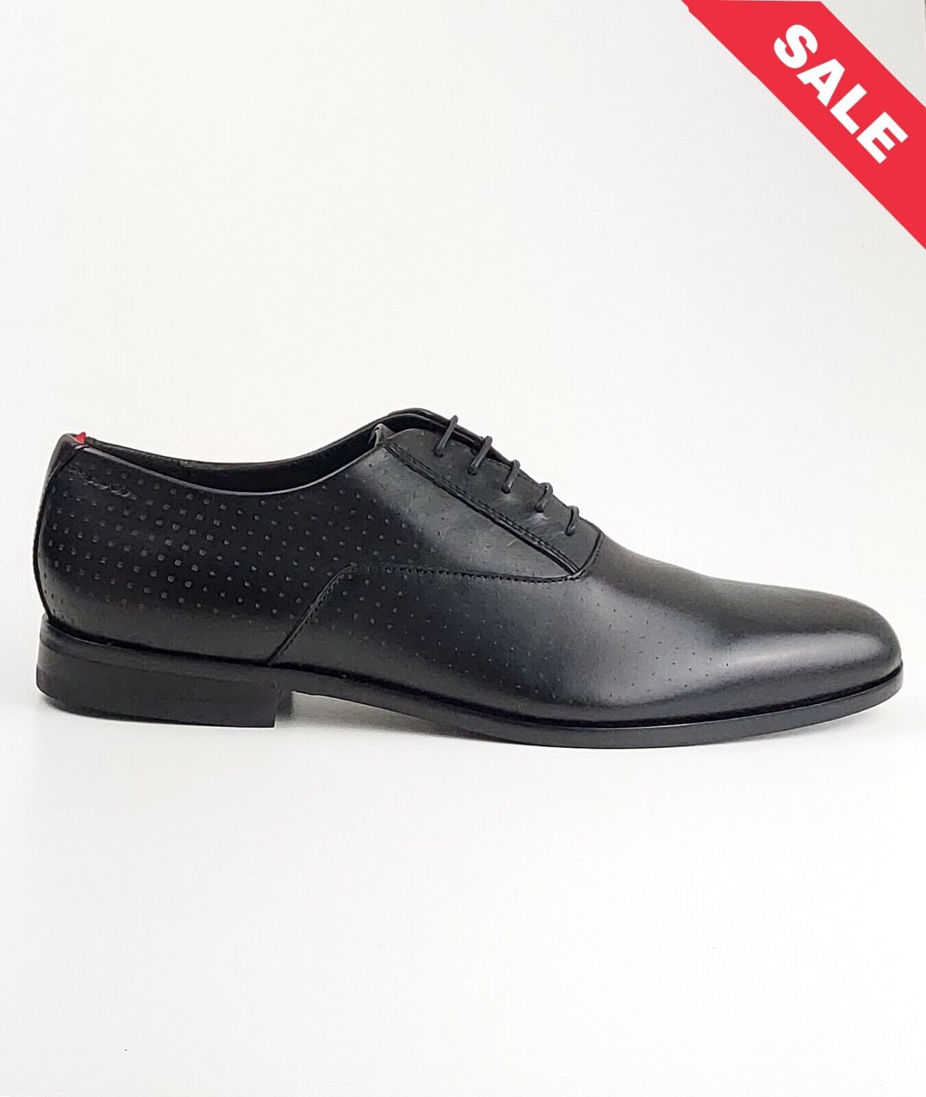 HUGO BOSS RUSTON OXFORD SHOES BLACK HALF PRINTED LEATHER RED TAB HEEL LOGO £289