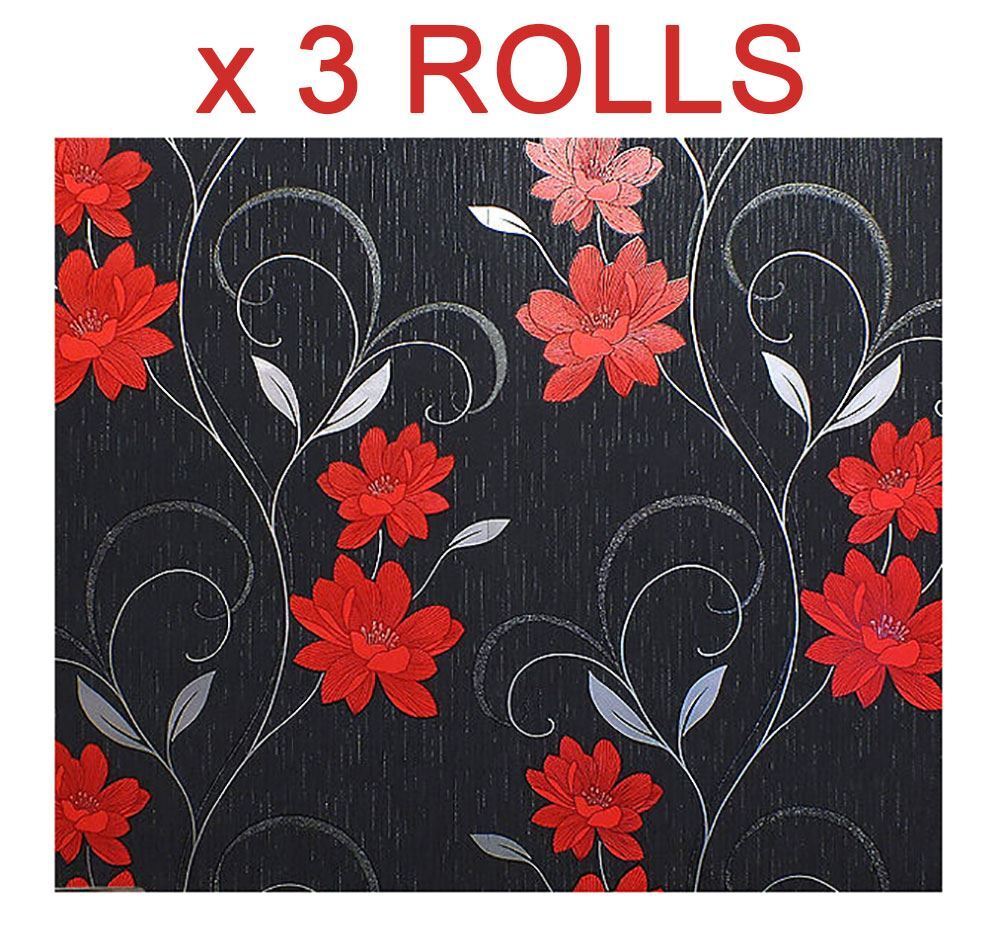 Black Grey Red Flower Wallpaper Glitter Effect Floral Textured Metallic x 3