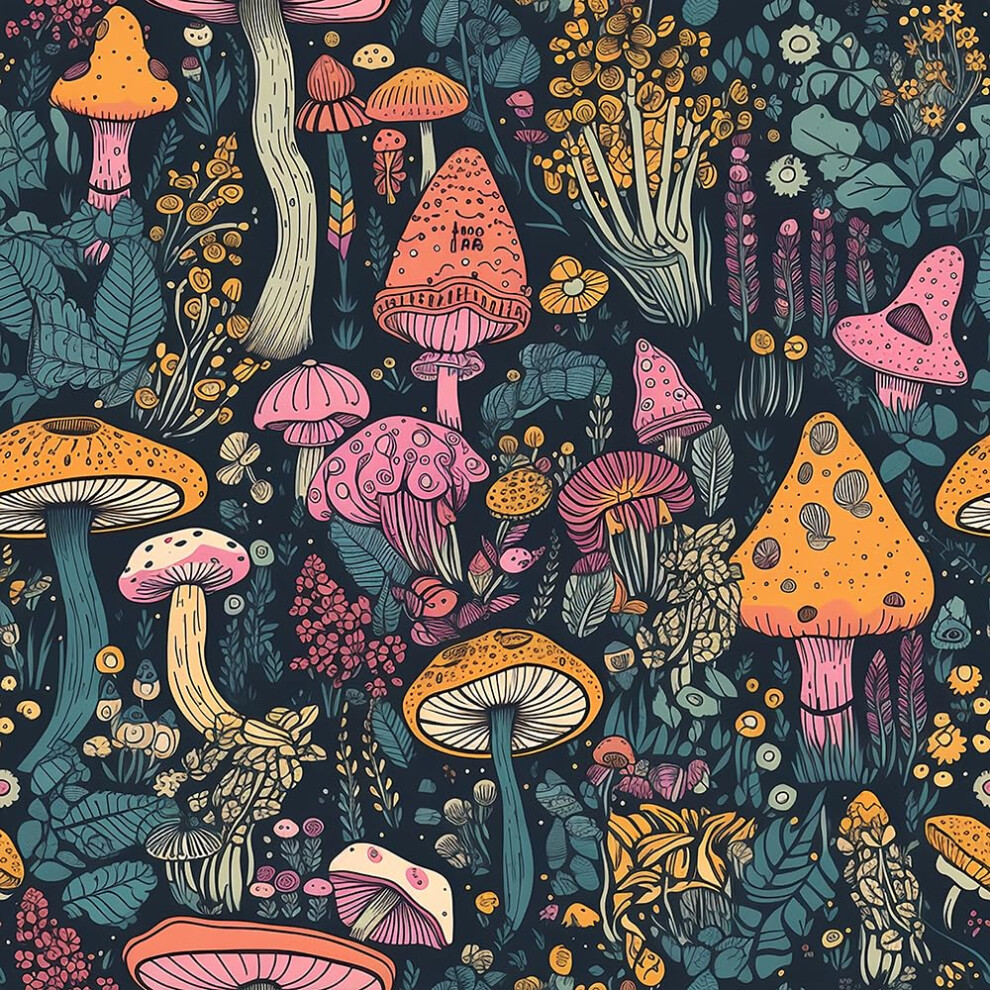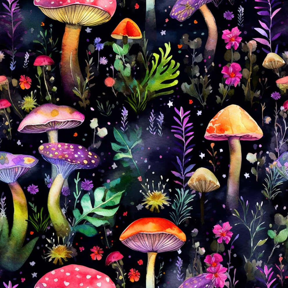 MuralPeel Coloful Pink/Yellow/Red Magical Mushroom Forest in Dark Navy Black Peel and Stick Wallpaper Vintage Easy Peel Off Self Adhesive Removable St
