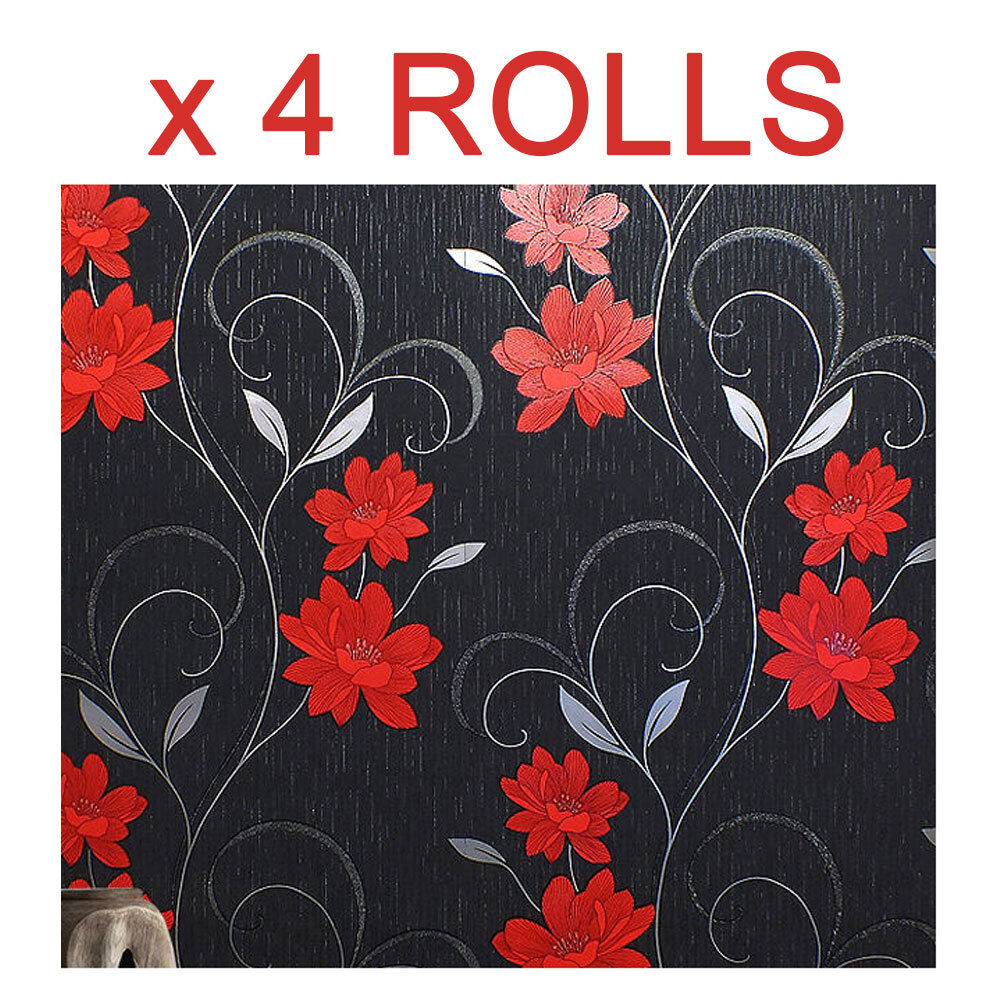 Black Red Flower Wallpaper Glitter Floral Textured Effect Metallic Bulk 4 Rolls