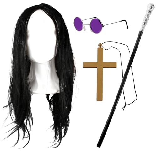 Prince Of Darkness Accessory Set for Adults – Includes Black Long Wig, Round Hippy Glasses, Cross Necklace, Silver Microphone and Silver Cane for Fancy Dress Parties