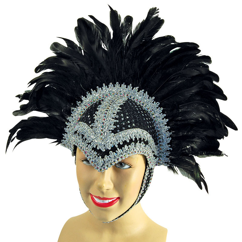 FEATHER HELMET BLACK WITH SILVER BRAID DETAIL AND PLUME FANCY DRESS ACCESSORIES