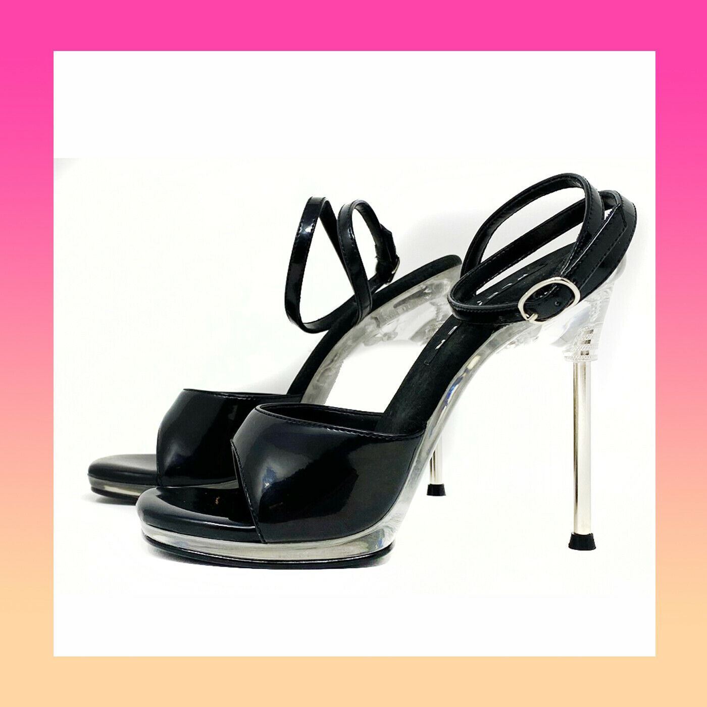 PLEASER BLACK CLEAR HEELS SILVER CHROME STRAPPY POLEDANCING SHOE EU35- UK SIZE 2