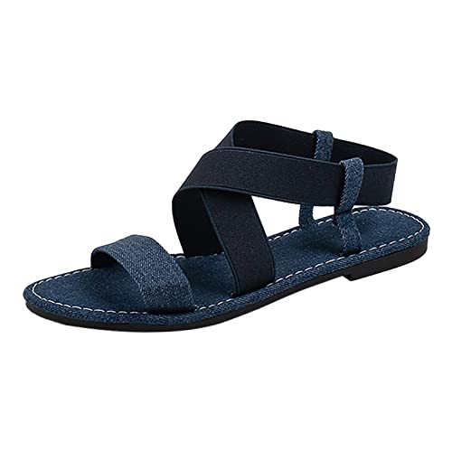 Summer Sandals For Women Elastic Solid Casual Toe Denim Flat Soft Bottom Breathable Shoes Light (Blue, 6.5) Walking Uk Womens White Wedge Size 6 Stylish Ladies Sandles 3 5 Black Heels Silver