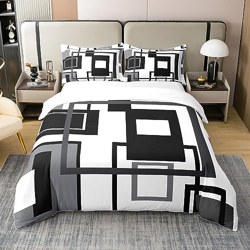 Homewish 100% Cotton Black White and Grey Comforter Cover Double for Adults Men,Abstract Geometric Bedding Set Square Striped Duvet Cover Simple Lines Quilt Cover 2 Pillow Cases Modern Bedroom Decor