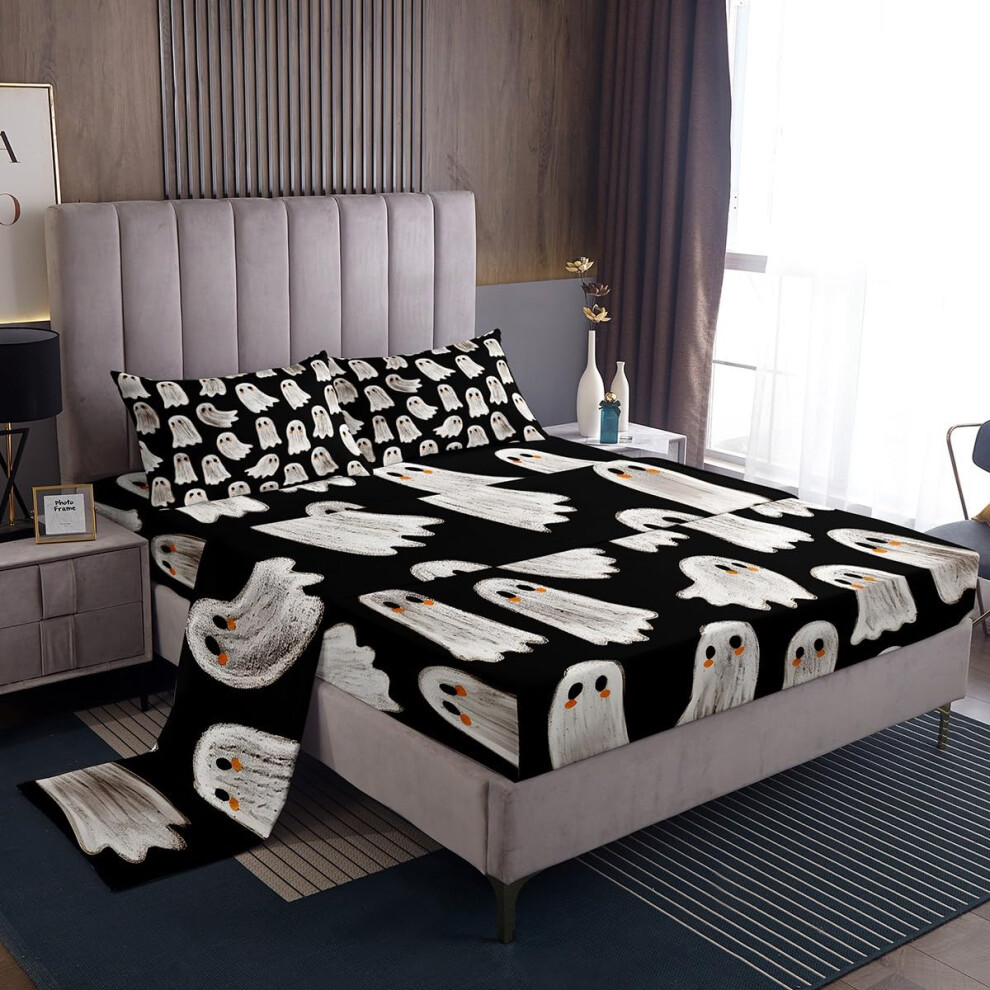 Black and White King Size Bedding Set with Halloween Ghost Pattern and Deep Pocket Fitted Sheet