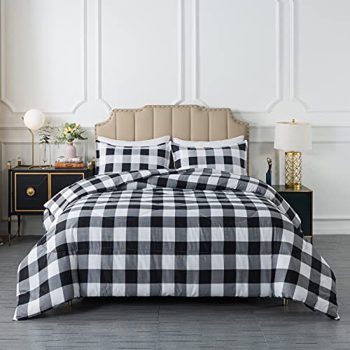 Caressma Lightweight Plaid Queen Size Comforter Set, Black White Plaid Comforter Bedding Set for All Seasons, Geometric Modern Pattern Print Soft Microfiber 3 Pieces Comforter with Pillowcases