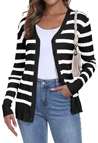 YUNDAI Womens Stripe Cardigans V Neck Long Sleeve Lightweight Button Down Jumpers Ribbed Knit Spring Fall Tops Cardigan for Women UK, Large Black Stripe White