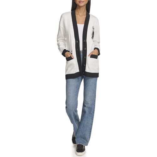 KARL LAGERFELD Women's Varsity Logo Cardigan with Patches Marled, Soft White Black, S