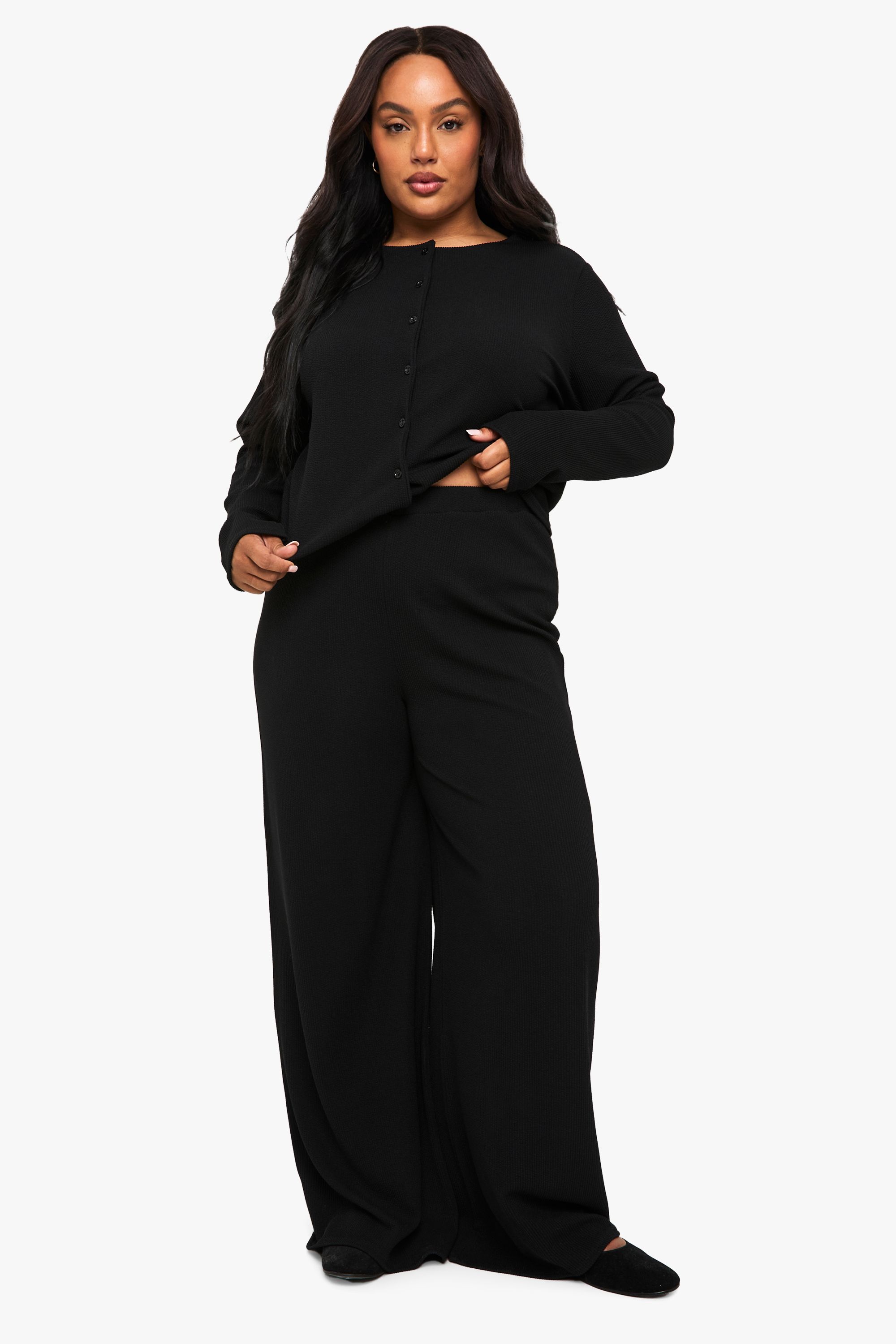 Boohoo Womens Plus Rib Cardigan and Wide Leg Trouser Co Ord - Black & Off-White - Size 22 UK