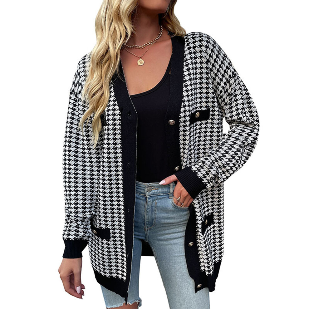 (Black White L) Cardigan Sweater Houndstooth V Neck Medium Length Buttons Black White