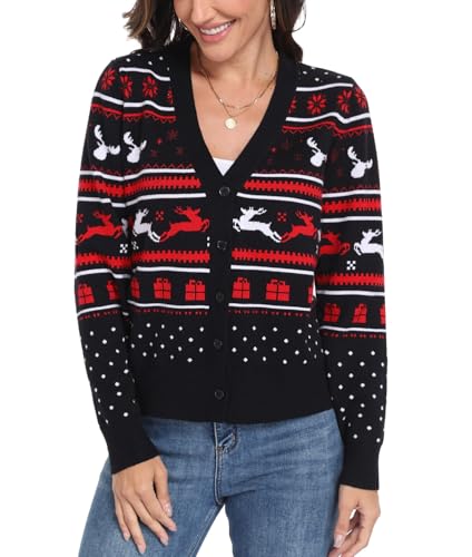 PrinStory Womens Christmas Cardigan V Neck Long Sleeve Jumpers Cardigans Ladies Button Down Knitwear Sweater (Christmas Black Red White Elk, M)