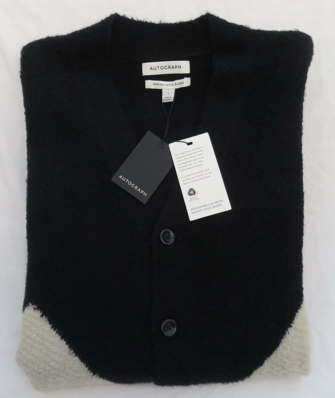 MEN'S MARKS AND SPENCER BLACK MIX PATTERNED MERINO WOOL BLEND CARDIGAN SIZE L