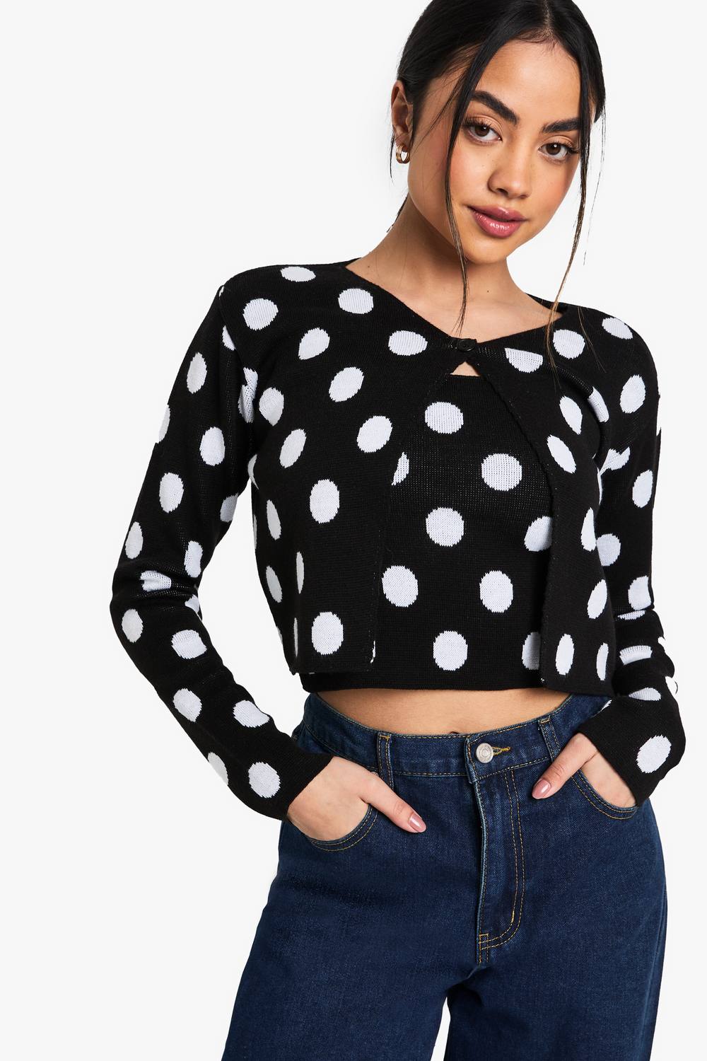 Womens Polka Dot Button Neck Cardigan And Cami Top Set - Black & White - L, Black & White