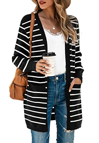 TASAMO Women's Cosy Cardigan Long Sleeve Open Front Multiple Color Stripe with Pockets(X-Large,Black White Stripe)