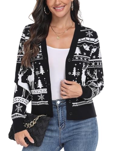 PrinStory Womens Christmas Cardigan V Neck Long Sleeve Jumpers Cardigans Ladies Button Down Knitwear Sweater (Christmas Black White Elk, M)