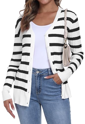 YUNDAI Womens Stripe Cardigans V Neck Long Sleeve Lightweight Button Down Jumpers Ribbed Knit Spring Fall Tops Cardigan for Women UK, Large White Stripe Black