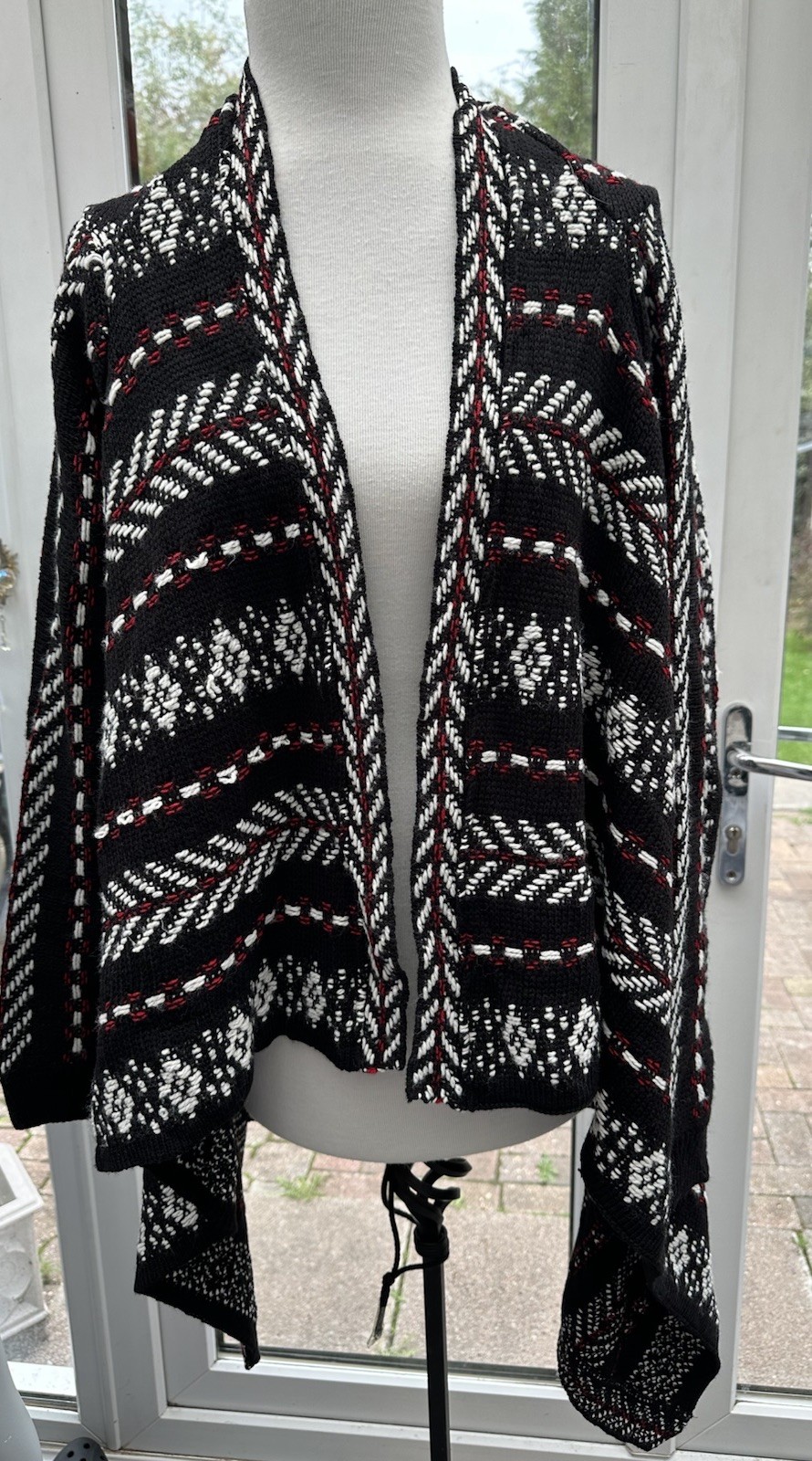 TU Asymmetrical Black Red White Aztec Open Cardigan Uk Size 16 Brand New