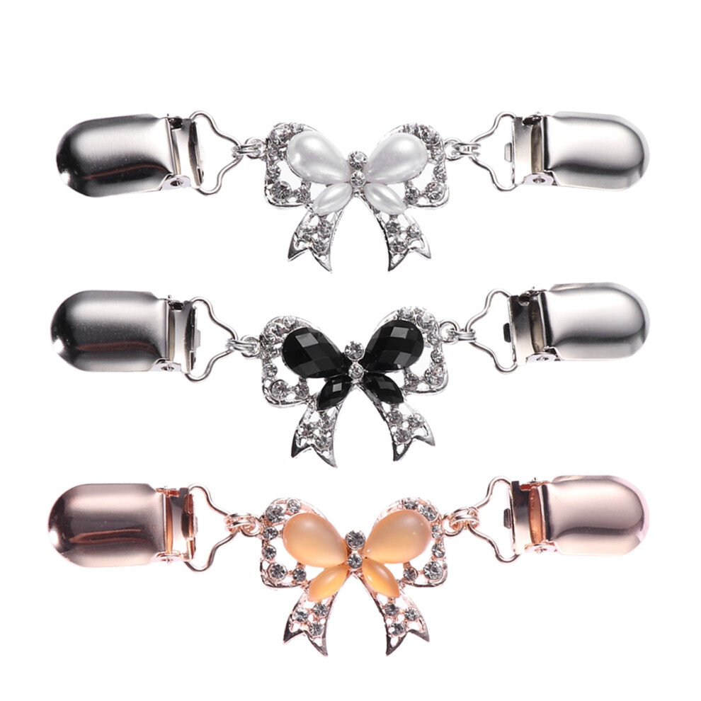 Mizh 3pcs Sweater Chain Creative Crystal Bowknot Sweater Clips Cardigan Clip for Dress Clothes (White, Black and Rose Gold)