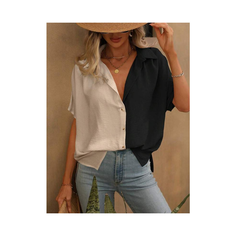 (Black and white, XL) Women's Fashion Spring/Summer Color Blocked Lapel Loose Street Style Cardigan Elegant Women's Short Sleeve Casual Office Blouse