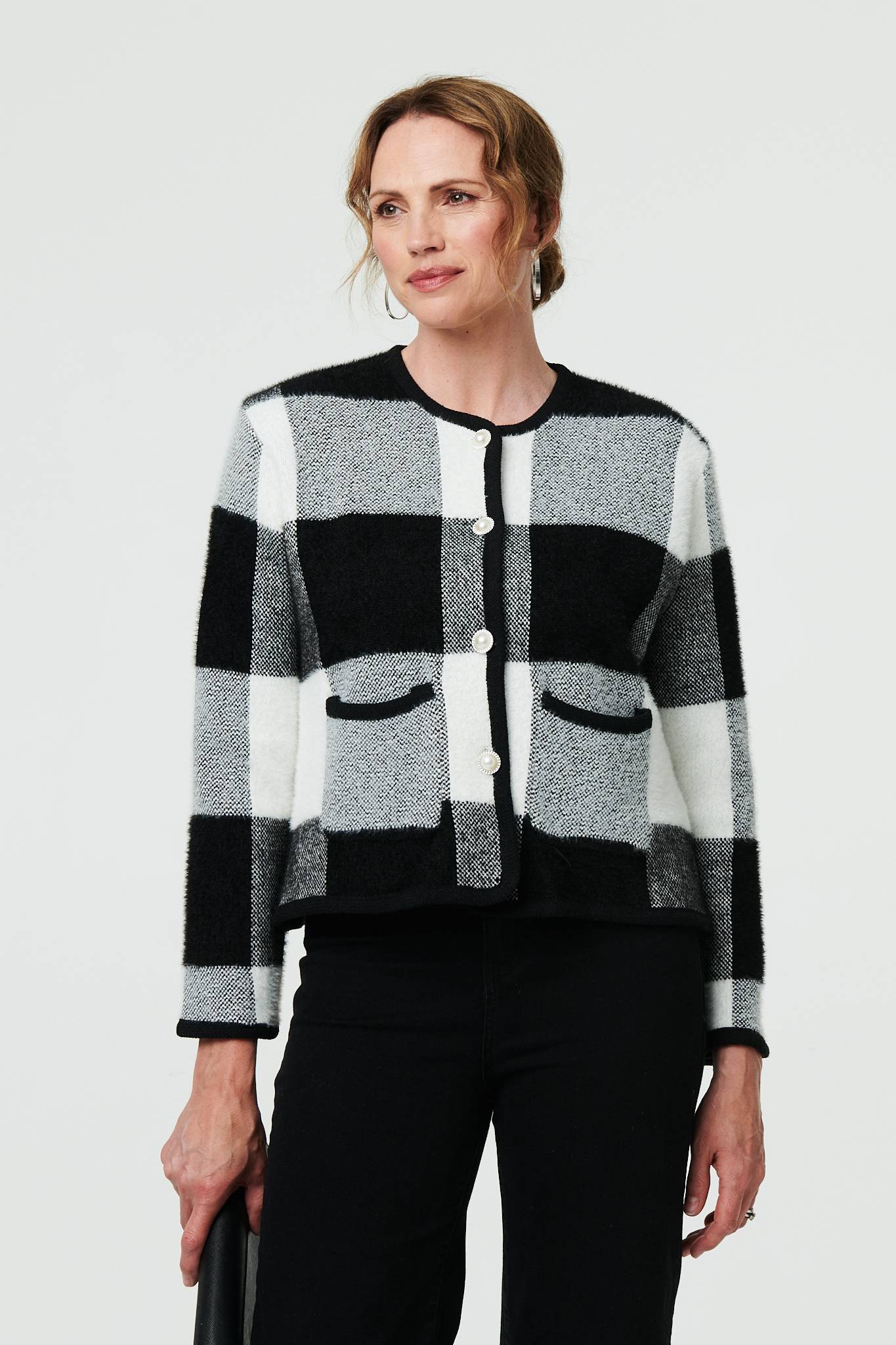 Izabel London Womens Black And White Checkered Long Sleeve Cropped Cardigan - Size UK 10-12