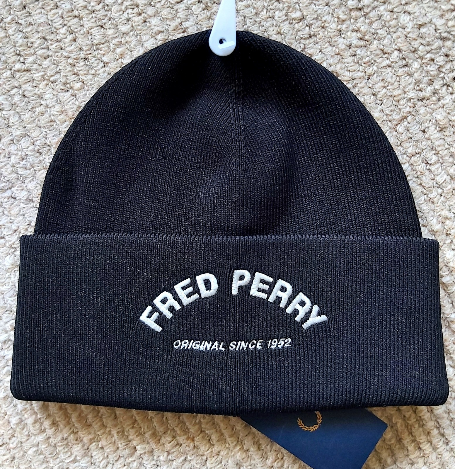 Genuine FRED PERRY Black Deeper Cuff White Logo BEANIE HAT UNISEX Tags