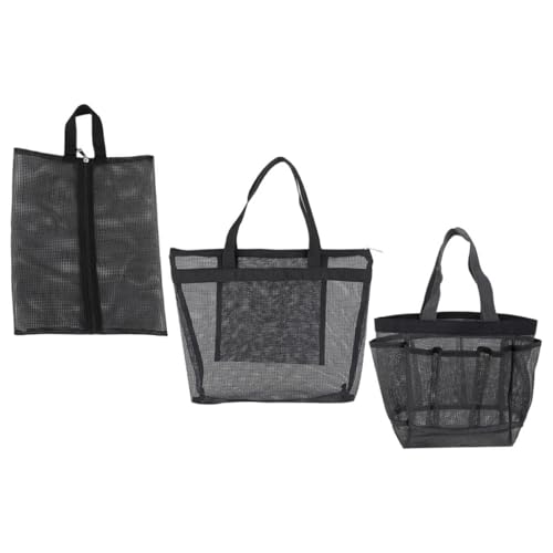 DECHOUS 3pcs Black Mesh Beach Tote Bag Set with Handheld Cosmetic Organizer, Travel Toiletry Mesh Pouch and Shoe Storage Bag for Shower, Sauna, and Travel